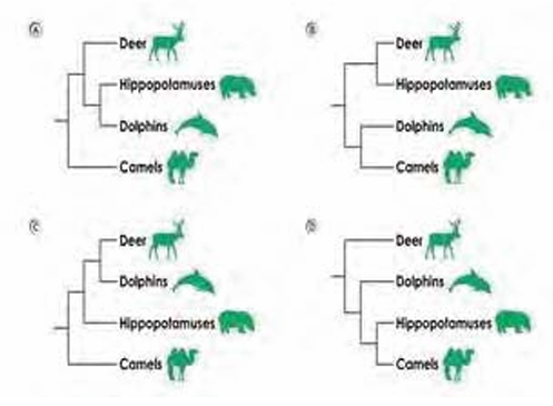 Q19. Some orders of land and marine mam mals are closely related. Molecu lar data recently collected from dol phins, camels, deer and hippopota muses have shown that hippopota muses are the closest living relatives of dolphins. Which cladogram in the image models this evolutinary rela tionship?