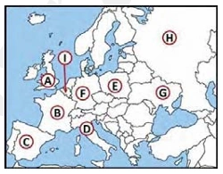 Q8. Which letter represents Spain on the map?